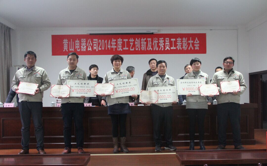 2014年3月4日上午黃山電器公司在四樓會議室召開了“2014年度工藝創新暨優秀員工表彰大會”,并邀請縣經信委領導汪光輝參加。會上,汪杏娟、鄭春鳴同志分別獲得了“2014年度工藝創新獎”,葉民強同志獲得了“2014年度合理化建議獎”,王納同志獲得了“原材料采購降低成本獎”。同時芯片一部擴散、腐蝕、光刻3個車間獲得了“2014年度安全生產先進班組”榮譽稱號,共有18位員工獲得了“2014年度優秀員工”榮譽稱號。